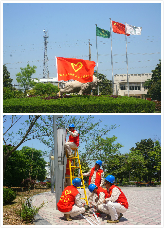 爬杆、拆灯、接线……,4月28日,宝应湖农场宝怡园广场上电管中心的党员、青年志愿者们正忙得热火朝天,该中心电工师傅们通过紧张施工为迎湖居委会的广场、部分道路的路灯等电力设施开展保养维修。