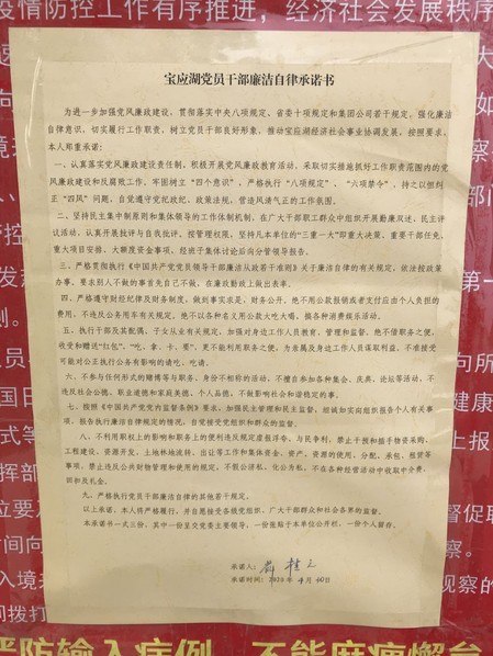 最近,只要走进场部大院或各基层单位公示栏,均能看到一张特殊的公示牌,上面贴满了一张张用A3纸打印的“廉洁自律承诺书”,该承诺书系4月30日该农场公司党风廉政建设会议上当场签订和递交的,其中除党委书记外,其他党委领导班子成员带头向党委书记递交,其他单位(部门)主要负责人依次递交,并于次日将各自“廉洁自律承诺书”在各自单位公示栏公开张贴,接受群众监督。图为刘圩居委会公示栏公示的该单位主要负责人“廉洁自律承诺书”。