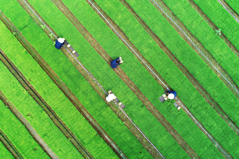 图为管理人员正在查看秧苗素质。