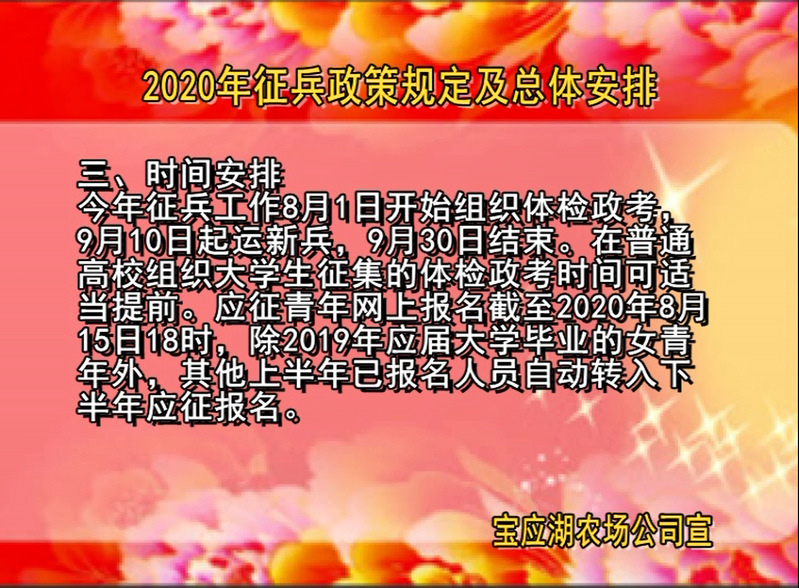 近日,漫步在宝应湖的大街小巷,浏览网站,观看LED大屏幕,都能看到征兵宣传广告……连日来,宝应湖农场公司的职工居民在很多场合都能与“征兵信息”不期而遇。
