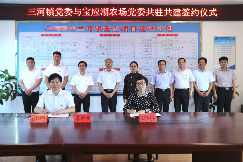 7月15日,洪泽区三河镇会议室里掌声阵阵,宝应湖农场公司党委与三河镇党委举行共驻共建签约仪式。农场公司党委书记李乾清、分公司副总经理夏永龙、赵志、总经理助理唐叶松和洪泽区人大副主任高万成、区委组织部副部长陈玲、三河镇党委书记朱沛军及相关班子成员参加仪式。