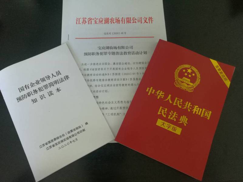(图为宝应湖农场有限公司制定计划文件,印制知识读本和《民法典》)