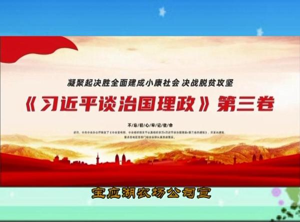 “我们的田野,美丽的田野……”日前,在宝应湖农场公司户外电子屏上,伴随着《我们的田野》优美的旋律,“治国有常民为本”“天下为公行大道”“凝聚起全面建成小康社会,决战脱贫攻坚”“习近平治国理政七大思维”……一条条宣传标语依次推呈在观众的面前。