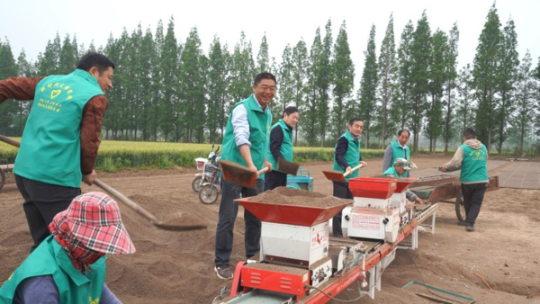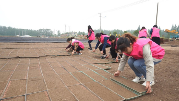 育秧现场,志愿者们分工合作。“顶呱呱”志愿服务队来到流水线育秧机前,铲土、放盘、倒谷,塑料托盘、营养基质、水稻种子依次进入生产线,在设备尾端源源不断地生产出的标准化盘式苗床。“巾帼”志愿服务队也不甘示弱,拖车、摆苗床,有条不紊,一盘盘秧盘在田野里成行、成列。“青年员工”志愿服务的小伙子们更是冲锋在前,两人一组,铺设管道……