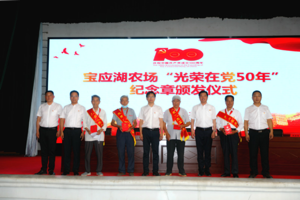 据了解,宝应湖农场公司共有85名老党员获得“光荣在党50年”纪念章。抚摸着金灿灿的纪念章,老党员们纷纷表示,在建党百年之际,获得这枚纪念章,无上光荣,极大增强了自身的荣誉感、归属感、使命感。今后,将一如既往地关心关注农场工作,离岗不离党、退休不褪色,努力为建设美丽富强的宝应湖贡献力量。