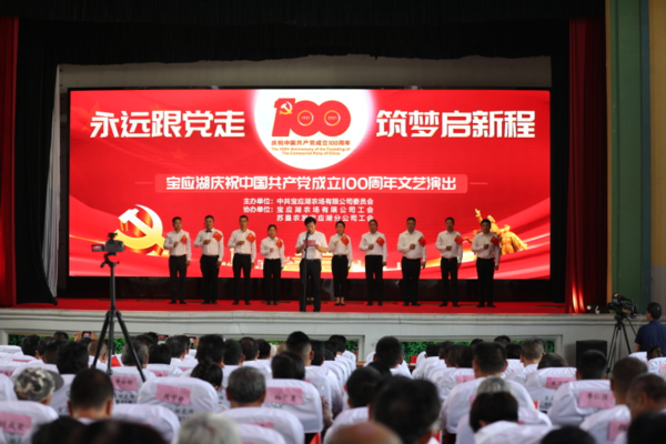 6月29日,宝应湖农场公司大礼堂内欢声笑语,喜迎中国共产党员成立100周年文艺演出正在举行,农场公司管理员、职工居民100余人欢聚一堂,载歌载舞庆祝党的生日。