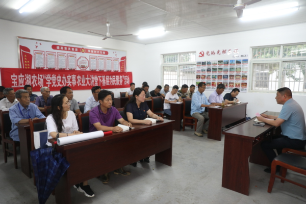 “什么是政策性农业保险?”“谁可以享受政策性农业保险保费补贴政策”……7月16日,宝应湖农场公司“学党史办实事 农业大讲堂下基层为民服务”活动在三生产区举行,宝应湖分公司副总经理唐叶松为职工居民作《推进农业保险 助力乡村振兴》主题宣讲。