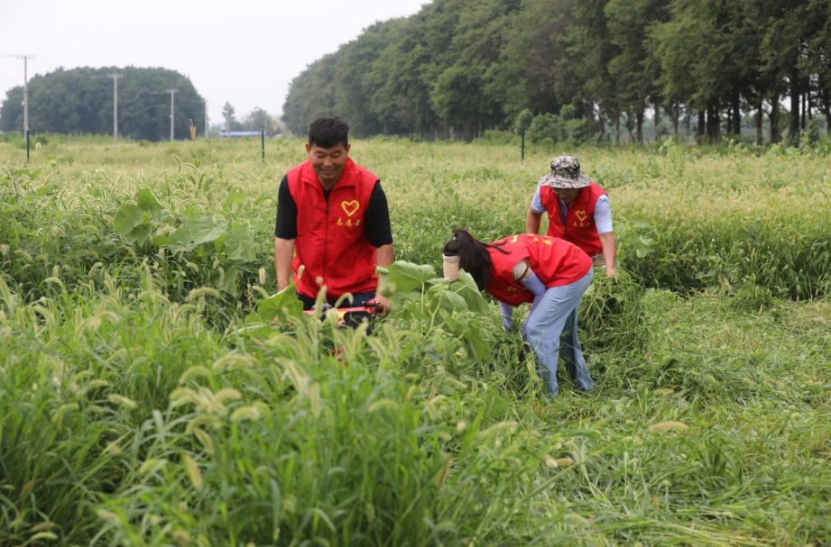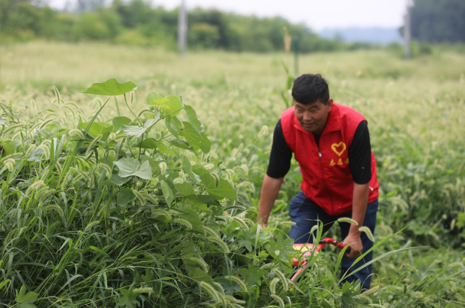 7月14日,室外温度40度。宝应湖农场杜仲林生态养鸡场,茂盛的杂草丛里一抹志愿红格外引人注目。