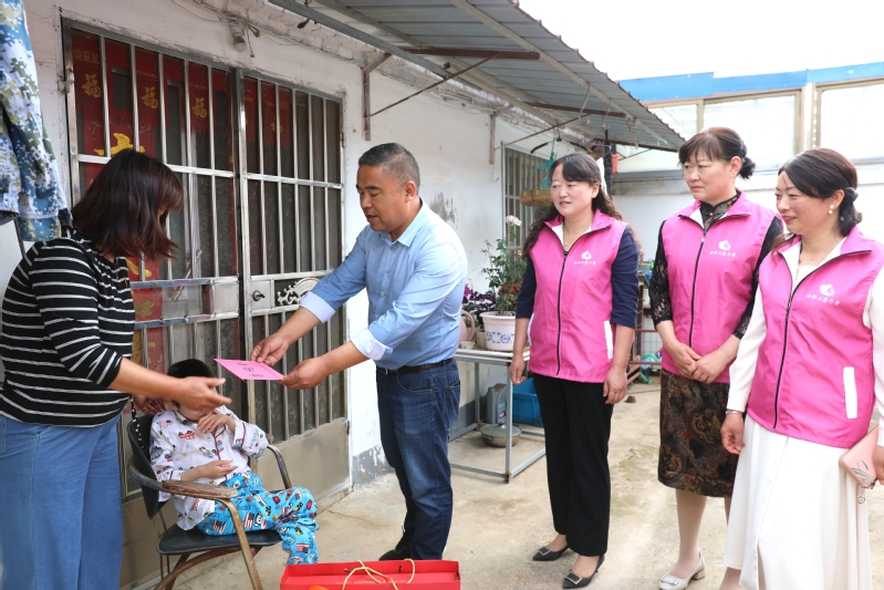 “小孩每天依靠家人喂饭,穿着尿不湿,生活无法自理,也没办法正常交流。感谢农场领导牵挂着我们,让我们一家人感受到浓浓温情。”二分场2队柏广亚今年16岁,看起来却仅七八岁大小,因长期卧床,还出现怕光反应。农场结合场情民生为其母亲提供招待所公益岗位,保障该家庭基本生活。“今天是六一儿童节,我们代表农场来慰问,记得把礼物带给孩子。”朱正松为一分场高鑫杨家庭送上慰问品。高鑫杨父母均存在智力缺陷,听到孩子托付给外公外婆照顾,已经上四年级,志愿者们很是欣慰。