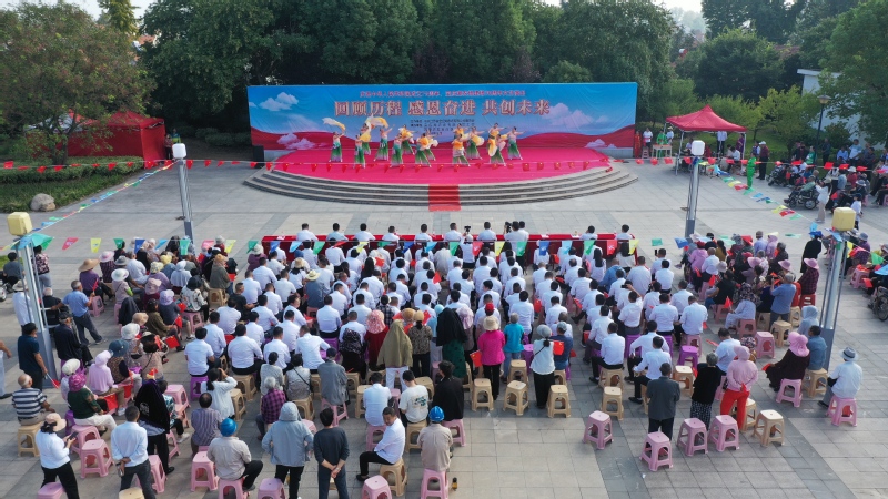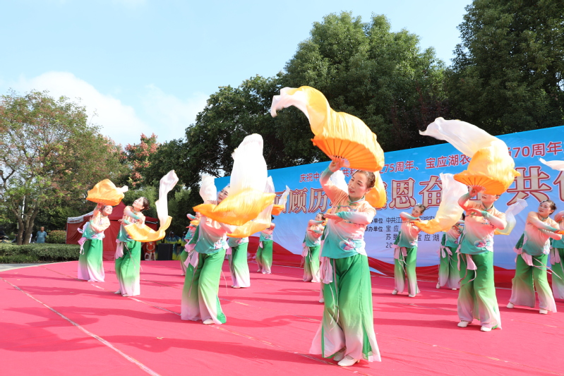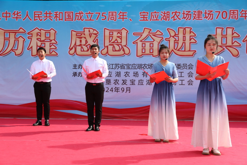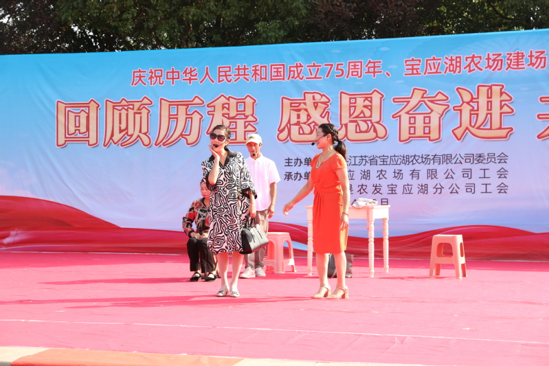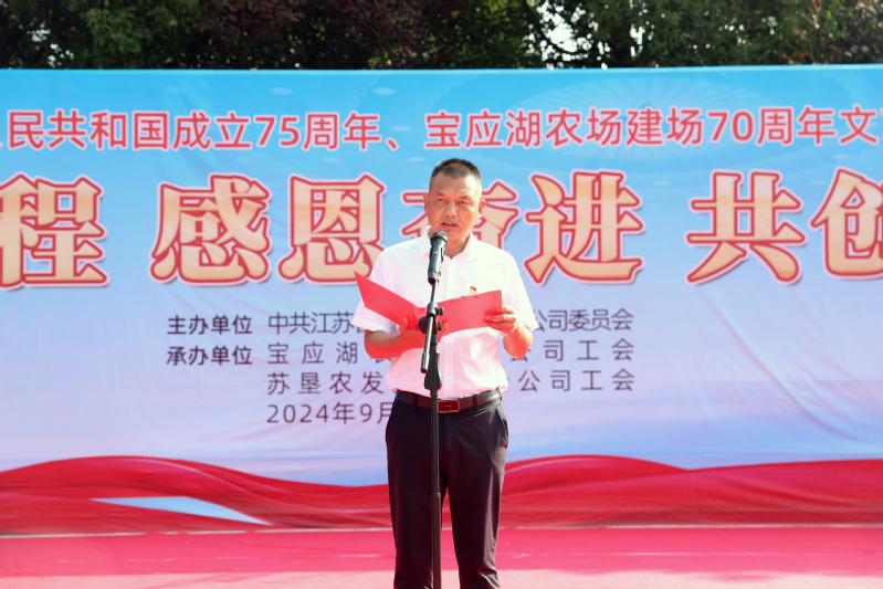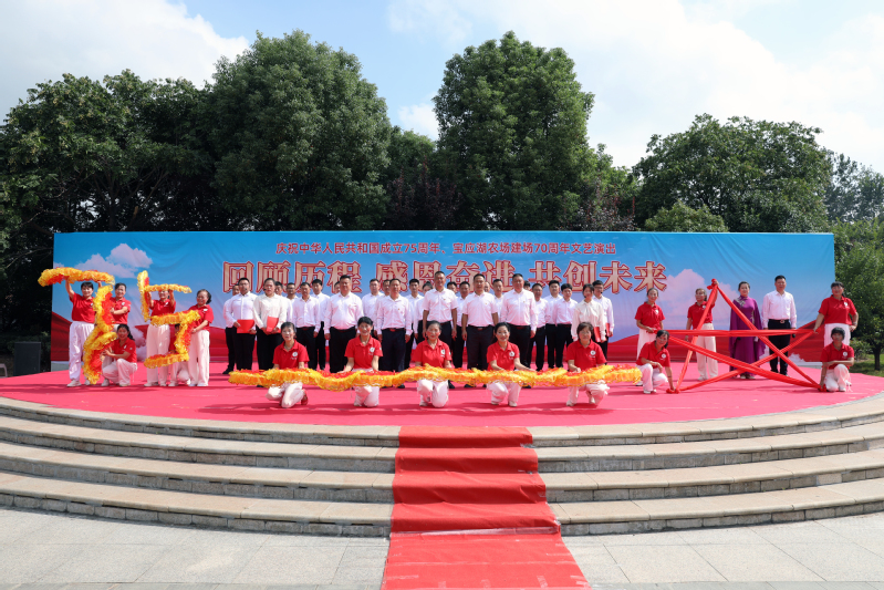 金秋九月、丹桂飘香。9月29日上午,宝应湖农场“回顾历程 感恩奋进 共创未来”--庆祝中华人民共和国成立75周年、宝应湖农场建场70周年文艺演出活动在刘圩文化广场举办。农场公司党委书记、董事长何善栋出席并致辞,农场公司总经理周爱国、纪委书记苏学军、副总经理唐叶松、分公司副总经理邵正林出席。全场管理人员和职工居民300多人参加。