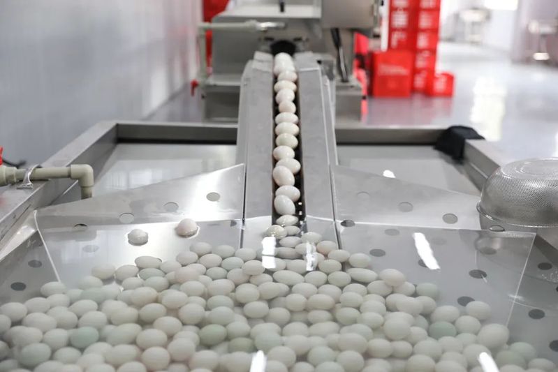 “我们的鸭蛋选自农场周边的宝应湖、高邮湖等湖区的生态养殖区,每枚都要经过光照验蛋、清洗。”生产主管孙强揭开腌制池的盖子,深色的卤汁中,上万枚鸭蛋正“沐浴”发酵。传统工艺之外,厂房里还藏着不少“黑科技”,智能温控系统让高温蒸煮灭菌得以实现,灌装线实现真空包装零污染,后期还将增加溯源二维码让每枚蛋都能查到“出生日期和出生地”。