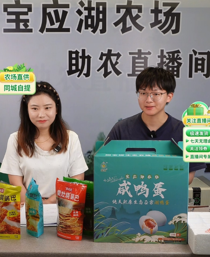“点击下方小黄车,这是我们农场的咸鸭蛋,都是原生态散养麻鸭所下,正宗湖蛋,买的放心,吃的安心……”近日,宝应湖农场的直播间里,青年志愿者肖锐、刘琳正熟练地向网友推介农产品。这场由农场青年志愿者团队主导的直播带货活动,正推动农场特色农产品走向更广阔的市场。