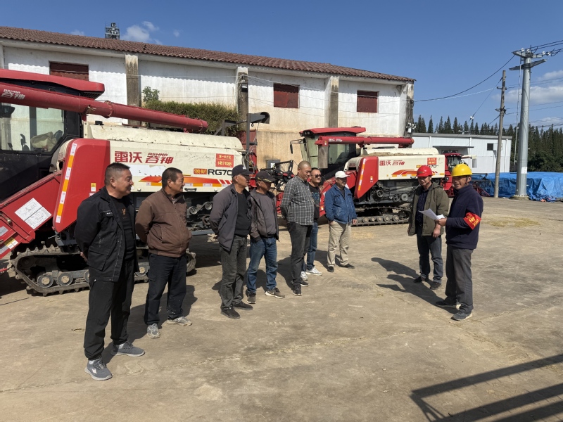 “农机检修要到位,安全弦儿不能松!”收割作业全面启动前,一生产区十二队队长王国来早早召集全体农机员,在田埂上开起了“地头安全会”。他手持安全操作指南,声音洪亮地逐项强调:“田间作业要眼观六路,及时避让田埂、石块等障碍物;转运车辆出发前必须检查刹车、灯光,坚决杜绝超载超速;大家务必穿戴好安全防护装备,绝不能抱着侥幸心理疲劳作业!”话音刚落,农机员们立即分工协作,对5台收割机、2辆转运车展开最后的调试检修,确保每台设备都以最佳状态投入“抢收攻坚战”。