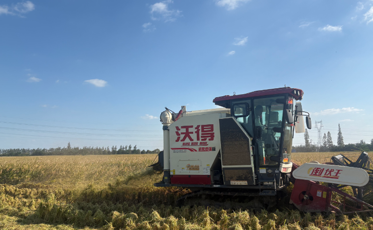 走进一生产区的稻田,收割机如同金色海洋中的“钢铁巨手”,在田垄间匀速前进。伴随着机器的轰鸣声,稻秆被快速切割、脱粒,金黄的稻谷顺着输送管源源不断涌入粮箱。“今天晴得通透,正是抢收的好时候!我们得跟时间赛跑,把成熟的稻谷赶紧收上来!”正在调度作业的产业工人朱德安擦了擦额头的汗珠,语气里满是紧迫感。