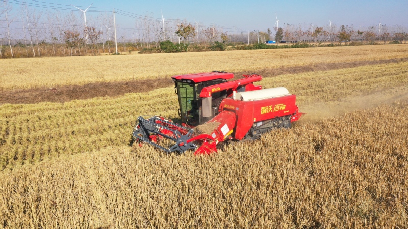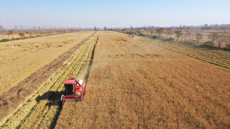 金秋时节,稻浪翻滚,硕果飘香。11月19日,江苏农垦宝应湖农场的有机水稻种植基地内一片繁忙景象,8台收割机穿梭在金色稻田中,伴随着机器的轰鸣,饱满的稻穗被尽数收割、脱粒,现场一派丰收的喜人图景。截至目前,千余亩有机水稻已全部收割完毕。