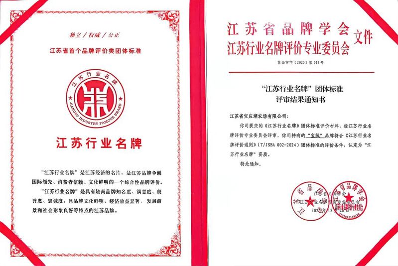 12月27日,2025江苏品牌创新发展大会在南京举行。会上发布第五批“江苏省著名品牌”暨第二批“江苏行业名牌”团体标准评定结果,宝应湖“宝绒”牌成功入选“江苏行业名牌”,品牌影响力再获省级权威认可。