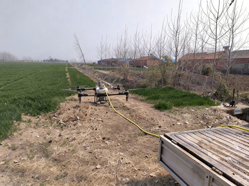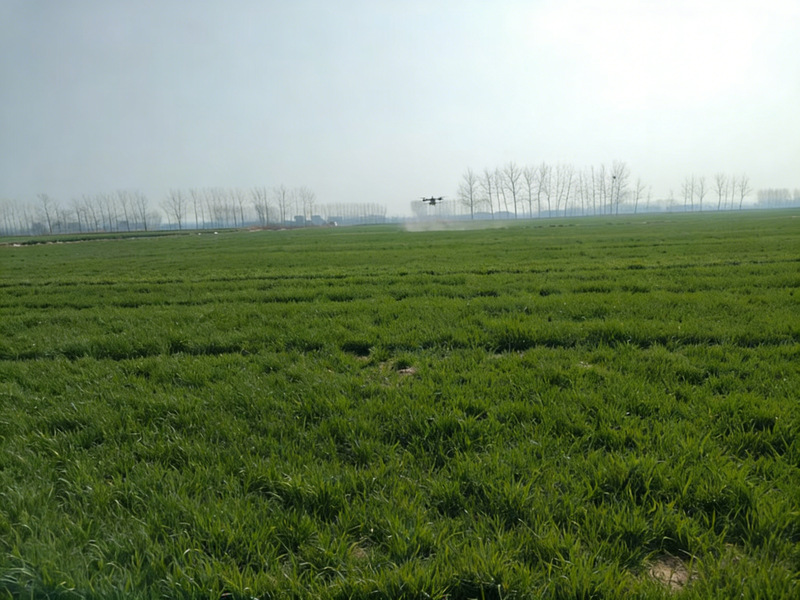 在摸清“病情”后,生产区整合资源,构建起“空中喷施+人工补防”的立体化防控体系。无人机携药升空,凭借灵活机动、高效覆盖的优势,对大面积连片麦田开展精准喷施;针对地块边缘、沟渠两侧等机械盲区,管理人员与农户手持器械,人工开展精准补防,严格落实“打到头、浇到边”要求,层层递进、全域覆盖。