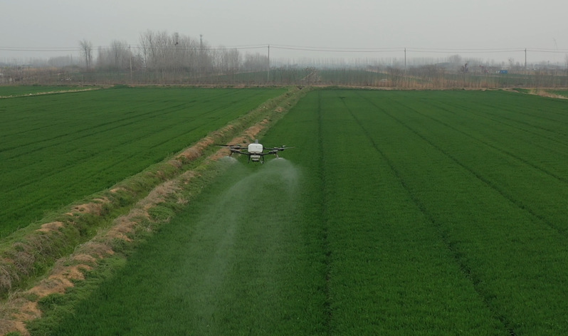 走进10队作业现场,工作人员操作的无人机腾空而起,按照预设航线平稳穿梭于连片麦田上空,实现全自主飞行、全自主喷洒。旋翼产生的强劲下行气流,将高效低毒药剂雾化后均匀喷洒至植株中下部与叶片背面,实现无死角、全覆盖精准施药。作业过程中,工作人员全程驻守田间,严格把控药剂配比、飞行高度、喷洒流量与作业时段,主动避开降雨、大风等不利条件,用责任与细心确保飞防作业质量与生产安全。